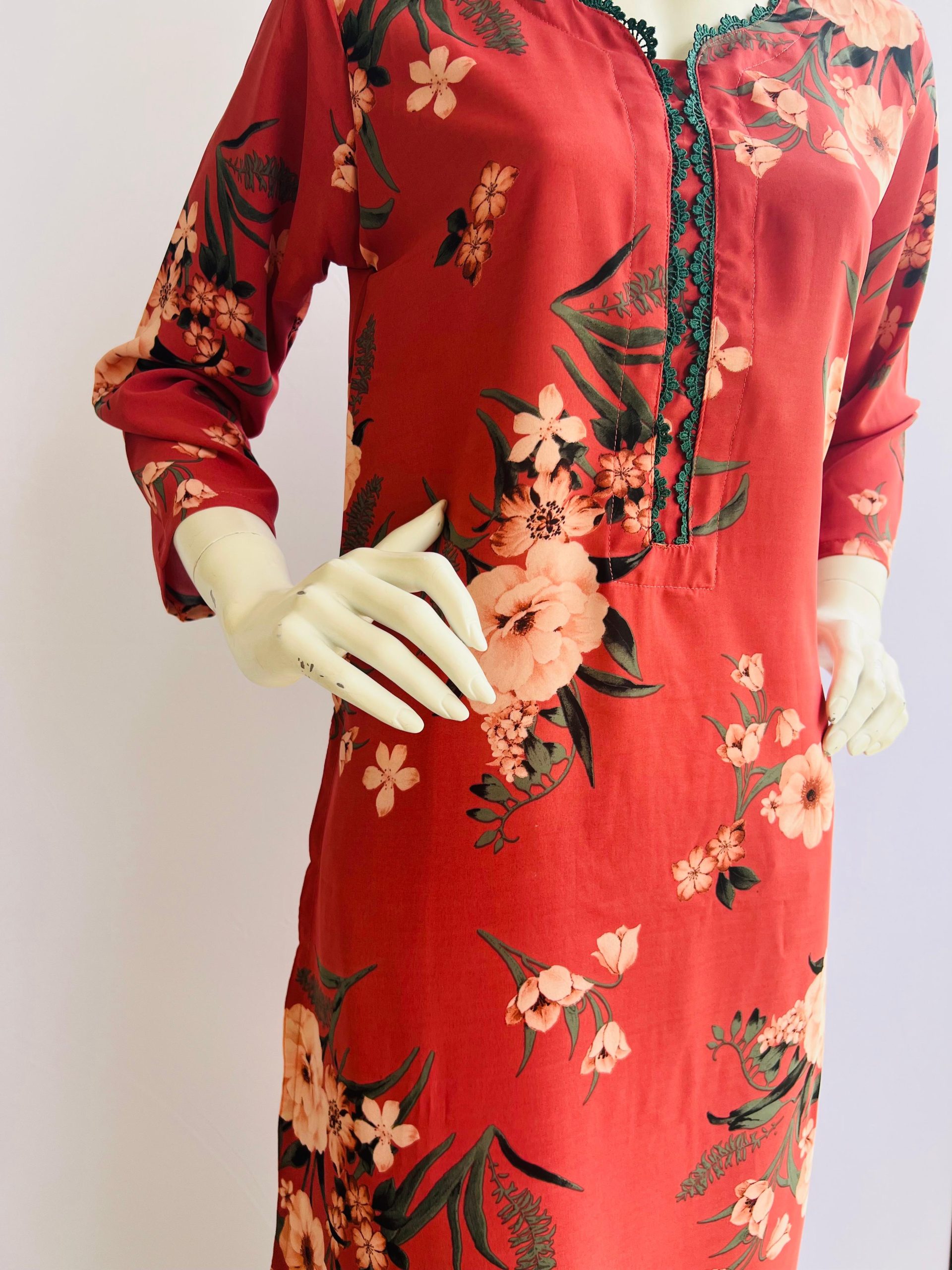 This is a beautifully tailored two-piece floral printed outfit featuring a straight-cut kurta and tapered pants. The kurta has a modest, modern neckline with black lace detailing down the placket, enhancing its elegance. The vibrant floral patterns in shades of blush pink, green, and cream spread across a deep brick red base, adding a romantic and refreshing feel. The pants match the kurta with the same floral print, creating a cohesive, graceful look.