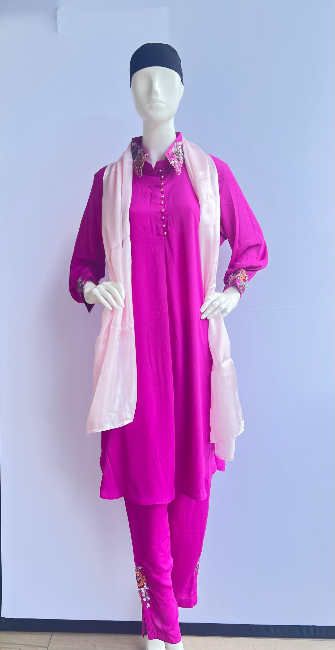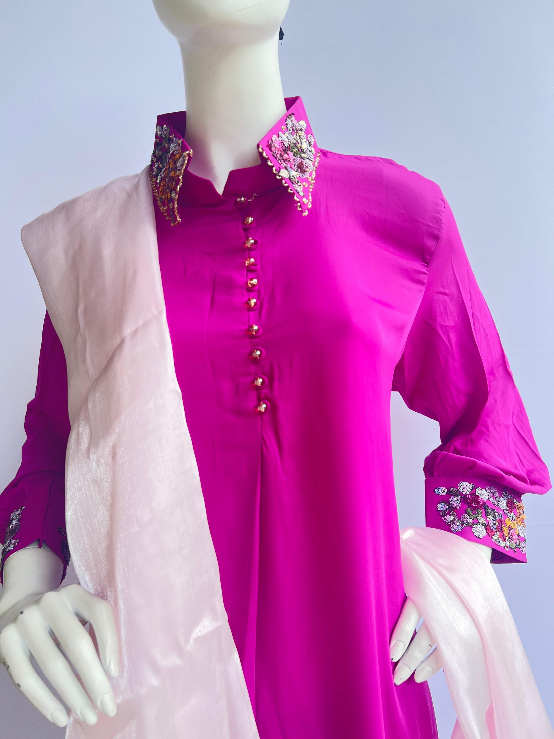 This vibrant two-piece outfit features a bright neon-pink kurta with delicate embellished floral embroidery on the collar, sleeve cuffs, and pant hem. The straight-cut pants . With decorative buttons on the front placket and subtle detailing, this set offers a graceful blend of tradition and contemporary flair — perfect for festive occasions or elegant daywear.