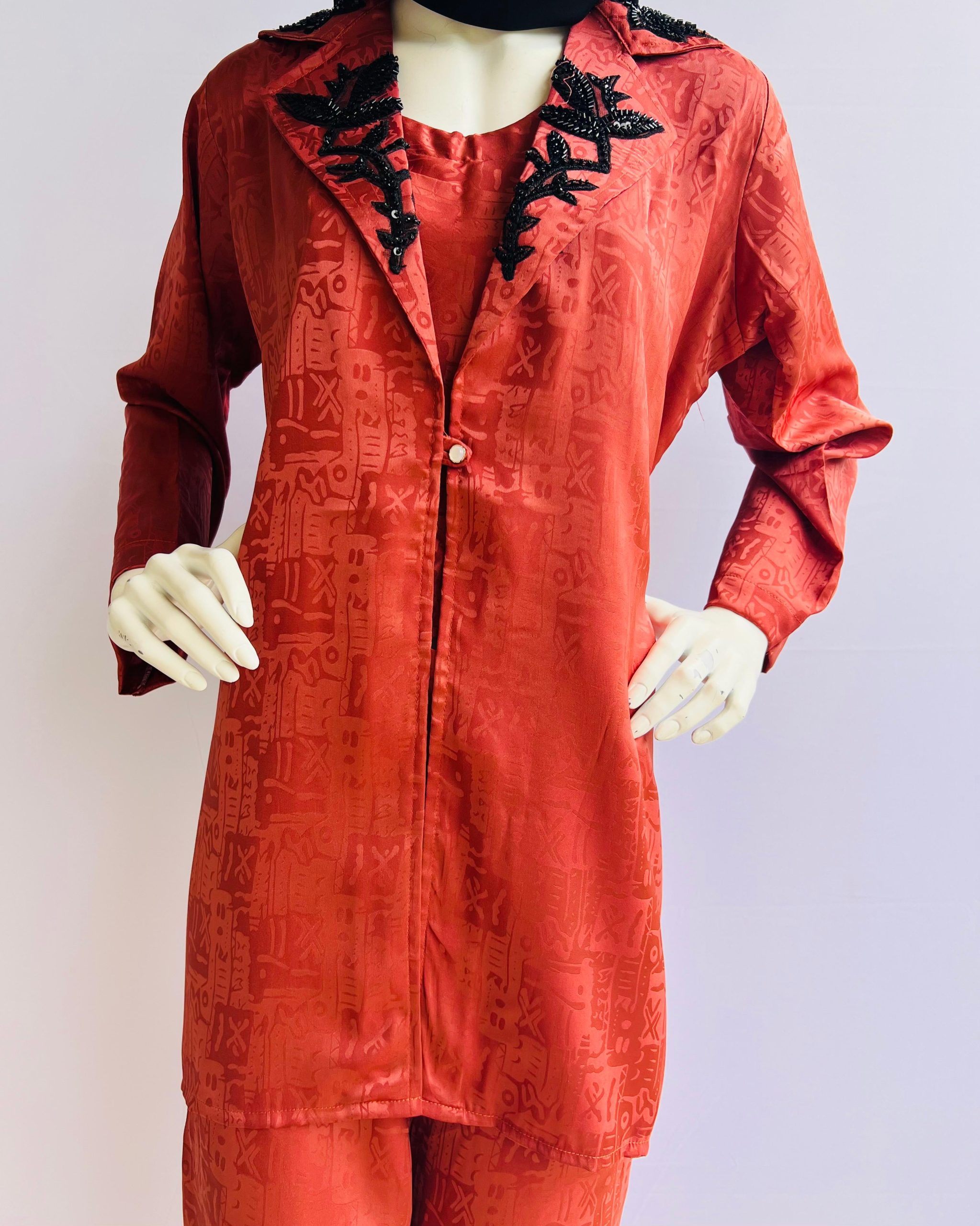 This outfit is a traditional two-piece ensemble consisting of a tunic-style top and wide-legged pants. The attire is crafted from a glossy jacquard fabric featuring abstract geometric patterns woven into the fabric. The top has a notched collar with black bead and lace embroidery on both sides, adding a decorative and formal touch.